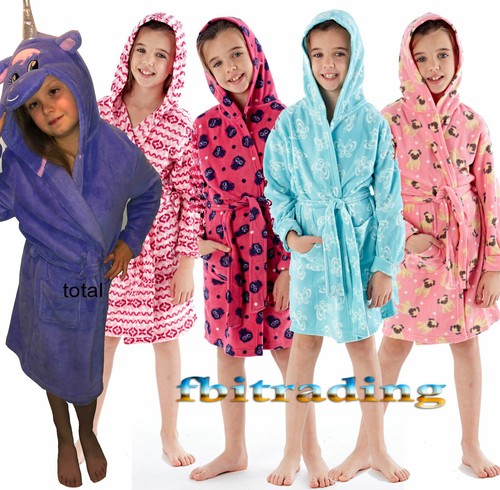 Kids Girls Dressing Gown Robe Hooded Polar Fleece Gowns Pug Owl Ebay